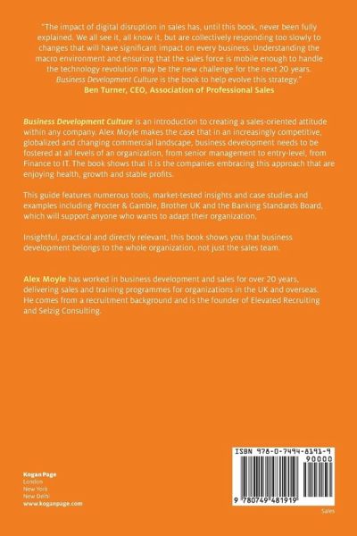 "The impact of digital disruption in sales has never been fully explained until now in Business Development Culture. We all see it, all know it, but are collectively responding too slowly to changes that will have significant impact on every business. Moyle puts the sales efforts at the centre of this exploration, introducing the various areas of the business that must now consider how they support this effort. Culture will always be at the forefront of any sales leader's world, understanding the macro environment and ensuring that their sales force is mobile enough to handle the technology revolution may be the new challenge for the next 20 years. Business Development Culture is the book to help challenge and evolve this strategy." Ben Turner, CEO, Association of Professional Sales