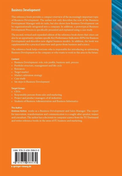 This reference book provides a compact overview of the increasingly important topic of Business Development. The author not only describes the role of the Business Development Manager with its tasks, but also shows how Business Development can be organizationally integrated into a company. In addition, a prototypical Business Development Process is specifically presented and explained using a case study.