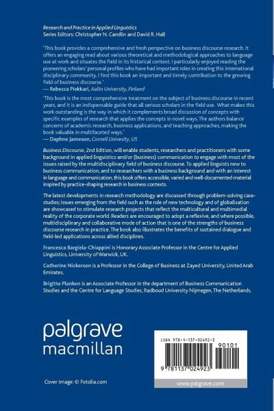 'This book provides a comprehensive and fresh perspective on business discourse research. It offers an engaging read about various theoretical and methodological approaches to language use at work and situates the field in its historical context. I particularly enjoyed reading the pioneering scholars' personal profiles who have had important roles in creating this international disciplinary community. I find this book an important and timely contribution to the growing field of business discourse.' - Rebecca Piekkari, Aalto University, Finland