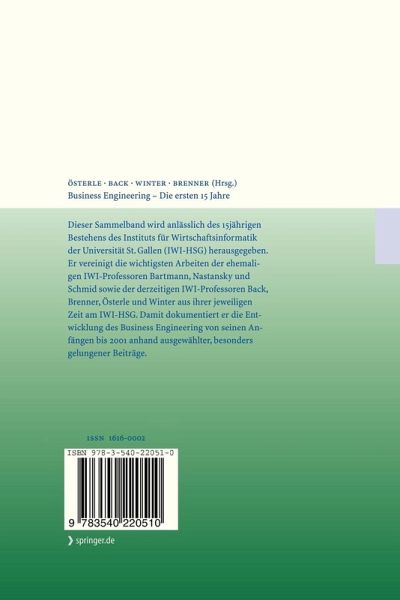 Dieser Sammelband wird anlässlich des 15jährigen Bestehens des Instituts für Wirtschaftsinformatik der Universität St. Gallen (IWI-HSG) herausgegeben. Er vereinigt die wichtigsten Arbeiten der ehemaligen IWI-Professoren Bartmann, Nastansky und Schmid sowie der derzeitigen IWI-Professoren Back, Brenner, Österle und Winter aus ihrer jeweiligen Zeit am IWI-HSG. Damit dokumentiert er die Entwicklung des Business Engineering von seinen Anfängen bis 2001 anhand ausgewählter, besonders gelungener Beiträge.