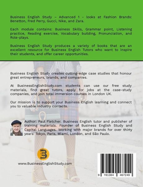 Business English Study - Advanced 1 - looks at Fashion Brands: Benetton, Fred Perry, Gucci, Nike, and Zara. Each module contains: Business Skills, Grammar point, Listening practice, Reading exercise, Vocabulary building, Pronunciation, and Role-plays. Business English Study produces a variety of books that prove an excellent resource for Business English Tutors who want to inspire their students. Business English Study creates cutting-edge case studies that honour great entrepreneurs, brands, and companies. At BusinessEnglishStudy.com students can use our free study materials, find great tutors, apply for jobs at the case-study companies, and join total immersion courses in London UK. Our mission is to support your Business English learning and connect you to valuable industry contacts.