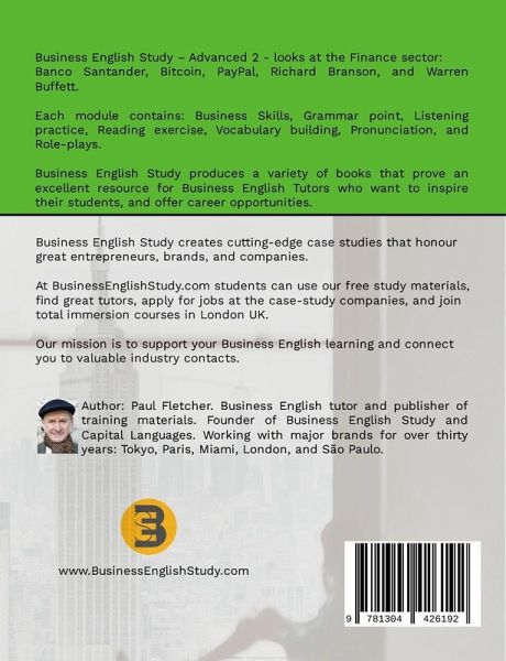 Business English Study - Advanced 2 - looks at Finance: Banco Santander, Bitcoin, PayPal, Richard Branson and Warren Buffett. Each module contains: Business Skills, Grammar point, Listening practice, Reading exercise, Vocabulary building, Pronunciation, and Role-plays. Business English Study produces a variety of books that prove an excellent resource for Business English Tutors who want to inspire their students.