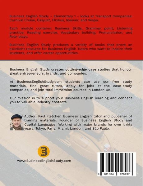 Business English Study - Elementary 1 - looks at Transport Companies: Carnival Cruises, easyJet, Flixbus, Ryanair, and Vespa. Each module contains: Business Skills, Grammar point, Listening practice, Reading exercise, Vocabulary building, Pronunciation, and Role-plays. Business English Study produces a variety of books that prove an excellent resource for Business English Tutors who want to inspire their students.