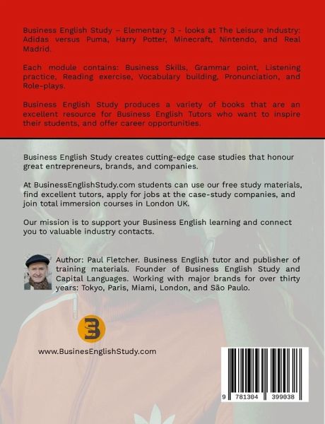 Business English Study - Elementary 3 - looks at The Leisure Industry: Adidas versus Puma, Harry Potter, Minecraft, Nintendo, and Real Madrid. Each module contains: Business Skills, Grammar point, Listening practice, Reading exercise, Vocabulary building, Pronunciation, and Role-plays. Business English Study produces a variety of books that are an excellent resource for Business English Tutors who want to inspire their students, and offer career opportunities.