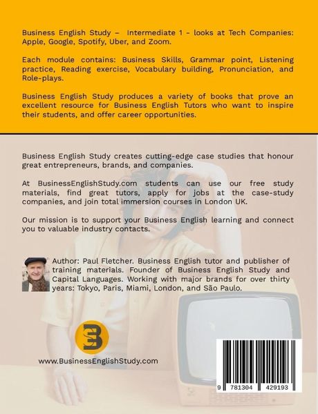 Business English Study - Intermediate 1 - looks at Tech Companies: Apple, Google, Spotify, Uber and Zoom. Each module contains: Business Skills, Grammar point, Listening practice, Reading exercise, Vocabulary building, Pronunciation, and Role-plays. Business English Study produces a variety of books that prove an excellent resource for Business English Tutors who want to inspire their students.