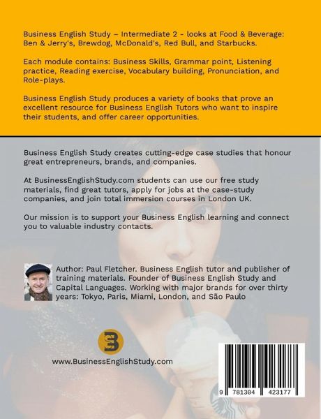 Business English Study - Intermediate 2 - looks at Food & Beverage: Ben & Jerry's, Brewdog, McDonald's, Red Bull, and Starbucks. Each module contains: Business Skills, Grammar point, Listening practice, Reading exercise, Vocabulary building, Pronunciation, and Role-plays. Business English Study produces a variety of books that prove an excellent resource for Business English Tutors who want to inspire their students.