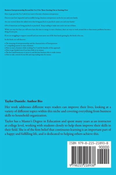 Business Entrepreneurship Beyond the 9 to 5 For Those Starting Out or Starting Over How to get past the 9 to 5 job if you want to become a business entrepreneur. Discover just how impactful and incredible being a business entrepreneur can be for you and your family. Are you worried about the added stress that living paycheck to paycheck causes you and your family? 63% of Americans are living paycheck to paycheck. Keep reading to make sure you're not one of them. While you may feel that you will never have the time or energy to start a business, there are ways to work around this so that money problems become a thing of your past. If you are struggling to support yourself and you want more out of life than barely getting by, this book is for you. In this book you will discover: • The meaning of entrepreneurship and the characteristics of Entrepreneurs • 7 compelling reasons to start a business • How to start a business while working 9 to 5 and the benefits of this approach • How to get funded even if you have little or no money • The best small businesses to invest in and the best business idea to make money • How to take control of your life and stop trading time for money