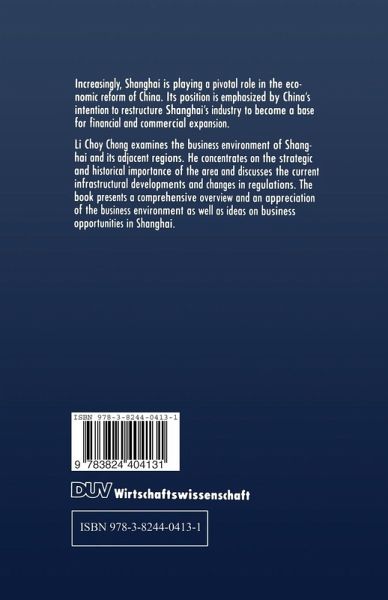 Increasingly, Shanghai is playing a pivotal role in the economic reform of China. Its position is emphasized by China's intention to restructure Shanghai's industry to become a base for financial and commercial expansion. Li Choy Chong examines the business environment of Shanghai and its adjacent regions. He concentrates on the strategic and historical importance of the area and discusses the current infrastructural developments and changes in regulations. The book presents a comprehensive overview and an appreciation of the business environment as well as ideas on business opportunities in Shanghai.