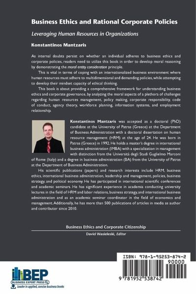 This book is about providing a comprehensive framework for understanding business ethics and corporate governance. As internal doubts persist on whether an individual adheres to business ethics and corporate policies, readers need to utilize this book in order to develop moral reasoning by demonstrating the moral entity consideration principle. This is vital in terms of coping with an internationalized business environment where human resources must adhere to multidimensional and demanding policies, while attempting to develop their mindset capacity of ethical thinking. This book is about providing a comprehensive framework for understanding business ethics and corporate governance, by analyzing the moral aspects of a plethora of challenges regarding human resources management, policy making, corporate responsibility, code of conduct, agency theory, workforce planning, information systems, and employment relationship.