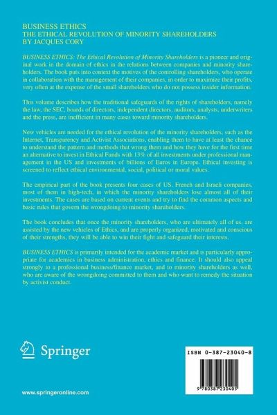 "Morten: And what are we going to do, when you have made liberal-minded and high-minded men of us? Dr. Stockman: Then you shall drive all the wolves out of the country, my boys!" (Ibsen, An Enemy of the People, Act V) The theoretical and empirical research of this book describes how the traditional safeguards of the rights of minority shareholders have failed in their duty and how those shareholders have remained practically without any protection against the arbitrariness of the companies and majority shareholders. The law, the SEC, society, boards of directors, independent directors, auditors, analysts, underwriters and the press have remained in many cases worthless panaceas. Nevertheless, in the Ethics of 2000 new vehicles have been developed for the protection of minority shareholders, mainly the Internet, transparency, activist associations and ethical funds. Those vehicles give the shareholders at least the chance to understand the pattern and methods that are utilized to wrong them and give them a viable alternative for investment in ethical funds. The new vehicles will prevent minority shareholders from using the Armageddon weapon, by ceasing to invest in the stock exchange and causing the collapse of the system, that discriminates against them.