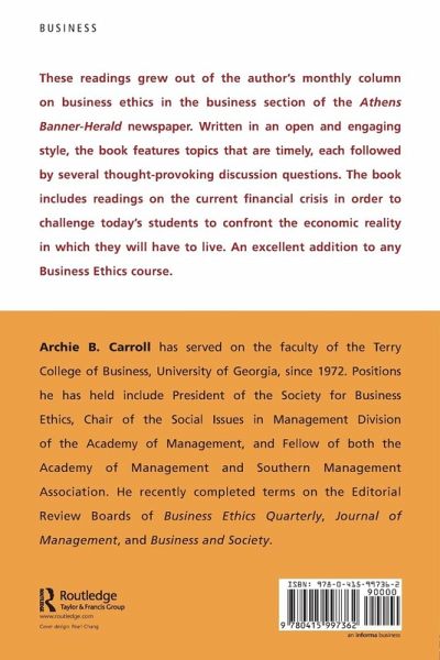 These readings grew out of the author's monthly column on business ethics in the business section of the Athens Banner-Herald newspaper. Written in an open and engaging style, the book features topics that are timely, each followed by several thought provoking discussion questions. The book includes readings on the current financial crisis in order to challenge today's students to confront the economic reality in which they will have to live. An excellent addition to any Business Ethics course.