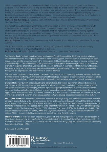 Dr R. I. (Bob) Tricker was a chartered accountant, an officer in the Royal Navy, and financial controller of an industrial company, before studying at the Harvard Business School and becoming a Research Fellow at Oxford University. He was Professor of Information Systems at Warwick University, then Director of the Oxford Centre for Management (now the Saïd Business School) for a decade, before being appointed Professor of Finance at the University of Hong Kong. His books include The Independent Director (1978) , Corporate Governance (1984), the first book with that title, The Economist Essential Director (5th edition, 2003) and Corporate Governance - principles, policies and practices (2nd edition, 2012). He currently holds visiting professorships at two Hong Kong Universities. Gretchen Tricker BA, MBA has been a researcher, journalist, and managing editor of a women's style magazine in Hong Kong. Subsequently, she was Senior Research Officer in the University of Hong Kong, and deputy-editor of Corporate Governance - an international review. She wrote Shares in Hong Kong, the centennial history of the Hong Kong Stock Exchange (1991).