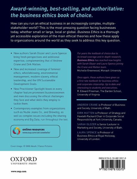 How can you be an ethical corporate citizen in an increasingly complex, multiple-stakeholder world? This is the most pressing question facing businesses today, small and large, local and global. Business Ethics is a thorough yet accessible exploration of the main ethical theories and how these apply to the major stakeholders facing this question. Written from a truly international perspective and supported by diverse and innovative learning features, this book provides the tools and concepts necessary to understand and effectively manage ethical challenges wherever you are in the world. 'Key Concepts' and 'Think Theory' boxes ensure the essential ideas are straightforward to grasp but don't go unchallenged, while 'Ethics in Action' boxes and Case Studies illustrate these ideas at play in the working world. Step into the shoes of a decision-maker with 'Ethical Dilemma' boxes and hear from them first hand with new 'Practitioner Spotlight' boxes, which feature fascinating insights from real-life practitioners on how they manage ethical decisions and what skills they consider to be crucial to success. The fourth edition offers a wealth of new cases and examples as well as updates of favourites from previous editions, including features on AirBnB, TOMS, and McDonalds. Bespoke video interviews with the practitioners from the book and new multiple-choice questions enhance the online resources for students, while workshop and flipped classroom activity ideas support lecturers. In addition, content has been thoroughly updated across the book and online to reflect the latest developments and issues surrounding corporate citizenship, globalization, and sustainability. Award-winning, best-selling, and up-to-date; this is the textbook of choice for those wishing to excel in business ethics. The book is supported by an extensive range of online resources: For students: Practitioner Spotlight videos and web links Additional Case Study web links Additional Ethics in Action web links Addition Ethics on Screen web links Think Theory responses Film list Ethics career guide Further reading Multiple-choice questions For lecturers: VLE content PowerPoint slides Test bank Case bank Sample course outline Teaching notes for Case Studies Teaching notes for Ethical Dilemmas Teaching notes for Ethics in Action features Teaching notes for Ethics on Screen features Ideas for structured workshops