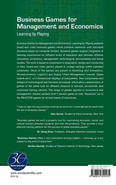 Business Games presents board and video business games which combine teamwork with individual decisions based on computer models. Business games support integration of learning experience for different levels of education and between different disciplines: economics, management, technological, environmental and social studies. The work is based on experience in adaptation, design and conducting of field, and board and video games played in college settings within standard schedules. Most of the games are played in Modeling and Simulation, Microeconomics, Logistics and Supply Chain Management courses. Game boards are 2- or 3-dimensional displays of subsystems, their components and phases of technological and business processes, which allow customization of games of the same type for different missions in schools, universities, and corporate training centers. The range of games applied to economics and management classes spreads from 2-person games for kid's "Aquarium" up to the REACTOR games for several teams of executives.
