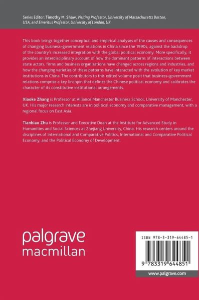 This book brings together conceptual and empirical analyses of the causes and consequences of changing business-government relations in China since the 1990s, against the backdrop of the country's increased integration with the global political economy. More specifically, it provides an interdisciplinary account of how the dominant patterns of interactions between state actors, firms and business organizations have changed across regions and industries, and how the changing varieties of these patterns have interacted with the evolution of key market institutions in China. The contributors to this edited volume posit that business-government relations comprise a key linchpin that defines the Chinese political economy and calibrates the character of its constitutive institutional arrangements.