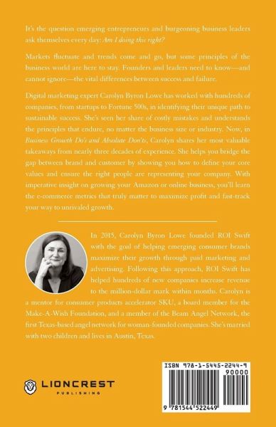 It's the question emerging entrepreneurs and burgeoning business leaders ask themselves every day: Am I doing this right? Markets fluctuate and trends come and go, but some principles of the business world are here to stay. Founders and leaders need to know-and cannot ignore-the vital differences between success and failure. Digital marketing expert Carolyn Lowe has worked with hundreds of companies, from startups to Fortune 500s, in identifying their unique path to sustainable success. She's seen her share of costly mistakes and understands the principles that endure, no matter the business size or industry. Now, in Business Growth Do's and Absolute Don'ts, Carolyn shares her most valuable takeaways from nearly three decades of experience. She helps you bridge the gap between brand and customer by showing you how to define your core values and ensure the right people are representing your company. With imperative insight on growing your Amazon or online business, you'll learn the eCommerce metrics that truly matter to maximize profit and fast-track your way to unrivaled growth.