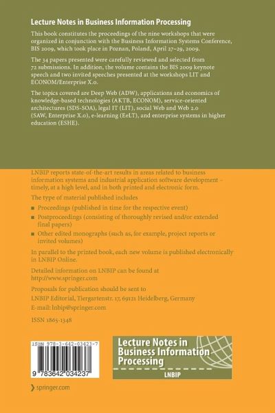 The 34 papers presented were carefully reviewed and selected from 72 submissions. In addition, the volume contains the BIS 2009 keynote speech and two invited speeches presented at the workshops LIT and ECONOM/Enterprise X.0.