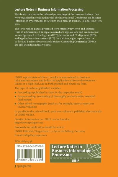 This book constitutes the refereed proceedings of the three workshops that were organized in conjunction with the International Conference on Business Information Systems, BIS 2011, which took place in Poznan, Poland, June 15-17, 2011.The 18 workshop papers presented were carefully reviewed and selected from 38 submissions. The topics covered are applications and economics of knowledge-based technologies (AKTB), business and IT alignment (BITA), and legal information systems (LIT). In addition, eight papers from the co-located Business Process and Services Computing Conference (BPSC) are also included in this volume.