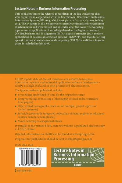 This book constitutes the refereed proceedings of the five workshops that were organized in conjunction with the International Conference on Business Information Systems, BIS 2014, which took place in Larnaca, Cyprus, in May 2014. The 27 papers in this volume were carefully reviewed and selected from 53 submissions and were revised and extended after the event. The workshop topics covered applications and economics of knowledge-based technologies (AKTB), business and IT alignment (BITA), digital currencies (DC), modern applications of business information systems (MODAPP), and tools for setting up and running a business in cloud computing (TSRB). In addition a keynote paper is included in this book.