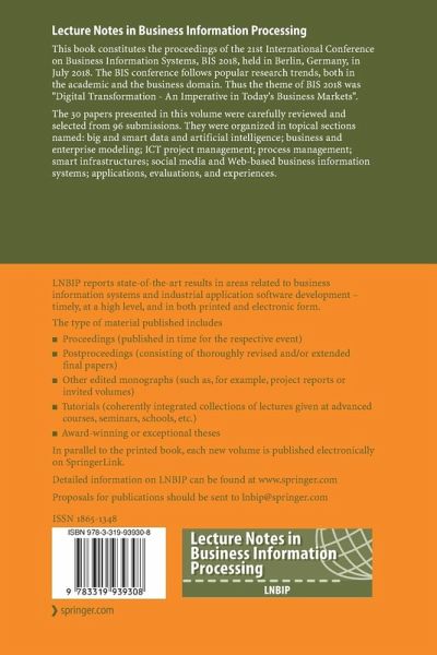 This book constitutes the proceedings of the 21st International Conference on Business Information Systems, BIS 2018, held in Berlin, Germany, in July 2018. The BIS conference follows popular research trends, both in the academic and the business domain. Thus the theme of BIS 2018 was "Digital Transformation - An Imperative in Today's Business Markets".