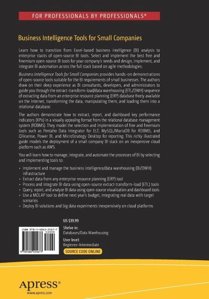 Business Intelligence Tools for Small Companies provides hands-on demonstrations of open-source tools suitable for the BI requirements of small businesses. The authors draw on their deep experience as BI consultants, developers, and administrators to guide you through the extract-transform-load/data warehousing (ETL/DWH) sequence of extracting data from an enterprise resource planning (ERP) database freely available on the Internet, transforming the data, manipulating them, and loading them into a relational database.