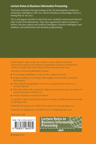 This book constitutes the proceedings of the 7th International Conference on Business Intelligence, CBI 2022, which took place in Khouribga, Morocco, during May 26-28, 2022.
