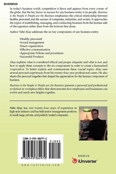 In today's business world, competition is fierce and appears from every corner of the globe. But the key factor in success for any business entity is its people. Business is the People & People are the Business emphasizes the critical relationship between healthy personnel and the success of companies, industries, and society. It approaches the topics of establishing, managing, and conducting business from the human side of the equation rather than from the bottom-line alone. Author Vahé Akay addresses the six key components of any business entity: · Healthy personnel · Sound management · Smart organization · Effective communication · Appropriate Policies and procedures · Successful Products Akay explains what is considered ethical and proper etiquette and what is not, and how to apply these concepts to the six components in order to create a humanized corporation. To better explain and communicate these crucial topics, Akay uses several personal experiences from his twenty-four-year professional career. He also shares the personal tragedies that shaped his appreciation for the human component of business. Business is the People & People are the Business presents a personal and professional evolution in workplace ethics that demonstrates how employees and businesses can evolve and reach new heights together.