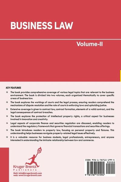 The book provides comprehensive coverage of various legal topics that are relevant to the business environment. The book is divided into two volumes, each organized thematically to cover specific areas of business law. The book explores the workings of courts and the legal process, ensuring readers comprehend the mechanisms of dispute resolution and the role of courts in enforcing laws and upholding justice. Extensive coverage is given to contract law, contract formation, elements of a valid contract, and the legal consequences of contract breaches. The book explores the protection of intellectual property rights, a critical aspect for businesses involved in innovation and creativity. Legal aspects of corporate finance and securities regulation are discussed, enabling readers to understand the regulatory framework that governs financial transactions and securities offerings. The book introduces readers to property law, focusing on personal property and fixtures. This understanding helps businesses navigate property-related legal issues effectively. It is a valuable resource for business students, legal professionals, entrepreneurs, and anyone interested in understanding the intricate relationship between law and commerce.