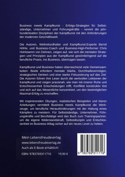 Business meets Kampfkunst -Erfolgs-Strategien für Selbstständige, Unternehmer und Führungskräfte - vereint die jahrhundertealten Disziplinen der Kampfkunst mit den Anforderungen der modernen Geschäftswelt. Die Autoren, Weltrekordhalter und Kampfkunst-Experte Bernd Höhle, und Business-Coach und Business-High-Performer Chris Hohlstamm von Dehnen, zeigen auf, wie sich die mentalen Strategien und Prinzipien aus der Kampfkunst gewinnbringend auf die berufliche Praxis übertragen lassen. Kampfkunst und Business haben überraschend viele Gemeinsamkeiten: Beide erfordern mentale Stärke, Durchhaltevermögen, strategisches Denken und eine starke Fokussierung auf das Ziel. Die Autoren führen ihre Leser durch die wertvollen Lektionen der Kampfkunst und zeigen praxisnah, wie man mit innerer Ruhe und Entschlossenheit Entscheidungen trifft, Konflikte konstruktiv löst und sich auf das Wesentliche konzentriert, um den bestmöglichen Maximal-Erfolg zu erschaffen. Mit inspirierenden Übungen, realistischen Beispielen und klaren Anleitungen vermittelt Business meets Kampfkunst die Werkzeuge, um berufliche Herausforderungen mit der Haltung eines Kämpfers zu meistern. Für Selbstständige, Unternehmer, Führungskräfte und Berufstätige wird das Buch zum Trainingspartner, um die eigene Widerstandskraft, Selbstdisziplin und Entschlossenheit im Business-Alltag auf ein neues Level zu heben.