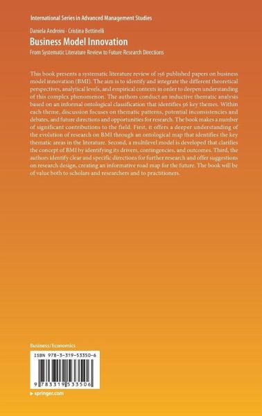 This book presents a systematic literature review of 156 published papers on business model innovation (BMI). The aim is to identify and integrate the different theoretical perspectives, analytical levels, and empirical contexts in order to deepen understanding of this complex phenomenon. The authors conduct an inductive thematic analysis based on an informal ontological classification that identifies 56 key themes. Within each theme, discussion focuses on thematic patterns, potential inconsistencies and debates, and future directions and opportunities for research. The book makes a number of significant contributions to the field. First, it offers a deeper understanding of the evolution of research on BMI through an ontological map that identifies the key thematic areas in the literature. Second, a multilevel model is developed that clarifies the concept of BMI by identifying its drivers, contingencies, and outcomes. Third, the authors identify clear and specificdirections for further research and offer suggestions on research design, creating an informative road map for the future. The book will be of value both to scholars and researchers and to practitioners.