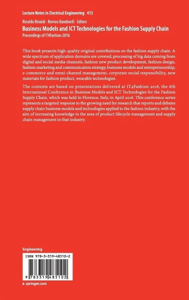 This book presents high-quality original contributions on the fashion supply chain. A wide spectrum of application domains are covered, processing of big data coming from digital and social media channels, fashion new product development, fashion design, fashion marketing and communication strategy, business models and entrepreneurship, e-commerce and omni-channel management, corporate social responsibility, new materials for fashion product, wearable technologies.