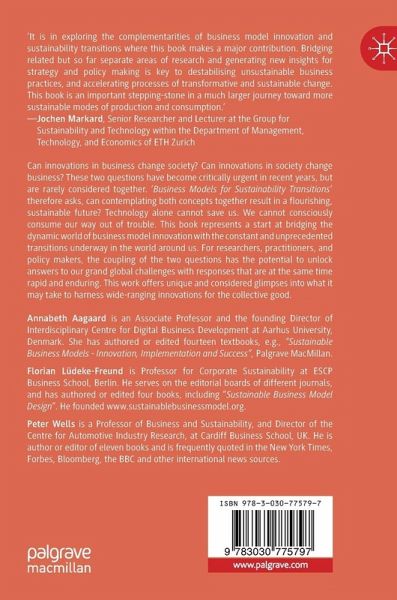 Annabeth Aagaard is an Associate Professor and the founding Director of Interdisciplinary Centre for Digital Business Development at Aarhus University, Denmark. Her research is focused on sustainable and digital business development, ecosystems and innovation, from which she has (co)¿authored 14 textbooks, including "Sustainable Business Models - Innovation, Implementation and Success", Palgrave. Florian Lüdeke-Freund is Professor for Corporate Sustainability at ESCP Business School, Berlin. He serves on the editorial boards of different journals, and has authored or edited four books, including "Sustainable Business Model Design". He founded www.sustainablebusinessmodel.org.  Peter Wells is a Professor of Business and Sustainability, and Director of the Centre for Automotive Industry Research, at Cardiff Business School, UK. He is author or editor of 11 books and is frequently quoted in the New York Times, Forbes, Bloomberg, the BBC and other international news sources.