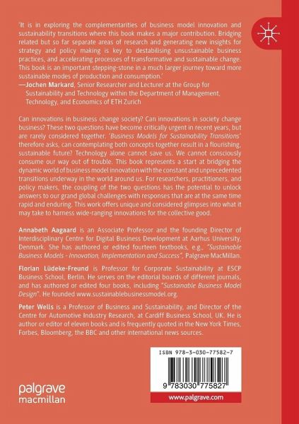 Annabeth Aagaard is an Associate Professor and the founding Director of Interdisciplinary Centre for Digital Business Development at Aarhus University, Denmark. Her research is focused on sustainable and digital business development, ecosystems and innovation, from which she has (co)¿authored 14 textbooks, including "Sustainable Business Models - Innovation, Implementation and Success", Palgrave. Florian Lüdeke-Freund is Professor for Corporate Sustainability at ESCP Business School, Berlin. He serves on the editorial boards of different journals, and has authored or edited four books, including "Sustainable Business Model Design". He founded www.sustainablebusinessmodel.org. Peter Wells is a Professor of Business and Sustainability, and Director of the Centre for Automotive Industry Research, at Cardiff Business School, UK. He is author or editor of 11 books and is frequently quoted in the New York Times, Forbes, Bloomberg, the BBC and other international news sources.
