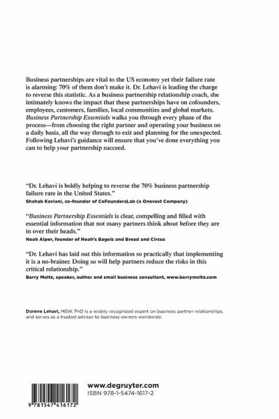 Business partnerships are vital to the US economy yet their failure rate is alarming: 70% of them don't make it. Dr. Lehavi is leading the charge to reverse this statistic. As a business partnership relationship coach, she intimately knows the impact that these partnerships have on cofounders, employees, customers, families, local communities, and global markets. Business Partnership Essentials walks you through every phase of the process-from choosing the right partner and operating your business on a daily basis, all the way through to exit and planning for the unexpected. This book is not a book on business startups and so it does not address the finances of starting up a partnership, but rather, it focuses on agreeing on all aspects of your relationship with your business partner. Following Lehavi's guidance will ensure that you've done everything you can to help your partnership succeed.