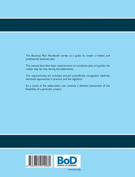 The Business Plan Handbook serves as a guide to create a holistic and professional business plan.The manual describes basic requirements on a business plan and guides the reader step by step during the elaboration.The requirements are oriented around scientifically recognized methods, dominant approaches in practice and legal guidelines.As a result of the elaboration, one receives a detailed assessment of the feasibility of a business idea.