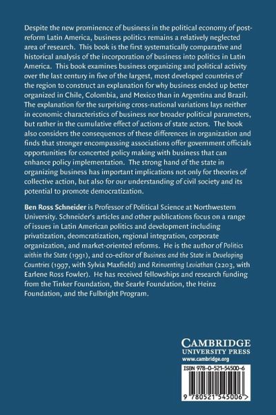 Schneiders book is the first systematically comparative and historical analysis of the incorporation of business into politics in Latin America, examining business organizing and political activity over the last century in five of the largest, most developed countries of the region. Why did business end up better organized in Chile, Colombia, and Mexico than in Argentina and Brazil? The explanation for the surprising cross-national variations lays neither in economic characteristics of business nor broader political parameters, but in the cumulative effect of actions of state actors.