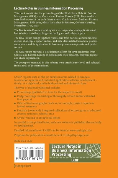Blockchain Forum.- Preface Blockchain Forum 2022.- Blockchain for Business Process Enactment: A Taxonomy and Systematic Literature Review.- Pupa: Smart Contracts for BPMN with Time-Dependent Events and Inclusive Gateways.- A Systematic Local Fork Management Framework for Blockchain Sandbox Environments.- Fine-grained Data Access Control for Collaborative Process Execution on Blockchain.- Challenges and Opportunities of Blockchain for Auditable Processes in the Healthcare Sector.- Measuring the effects of Confidants on Privacy in Smart Contracts.- Threshold Signature for Privacy-preserving Blockchain.- Robotic Process Automation (RPA) Forum.- Preface Robotic Process Automation (RPA) Forum 2022.- From Natural Language to Workflows: Towards Emergent Intelligence in Robotic Process Automation.- Towards an Integrated Platform for Business Process Management Systems and Robotic Process Automation.- Rolling back to manual work: An exploratory research on RoboticProcess Re-Manualization.- Steering the Robots: An Investigation of IT Governance Models for Lightweight IT and Robotic Process Automation.- Identifying the Socio-Human Inputs and Implications in Robotic Process Automation (RPA): A Systematic Mapping Study.- A Human-in-the-loop Approach to Support the Segments Compliance Analysis.- Recommending Next Best Skill in Conversational Robotic Process Automation.- Process discovery analysis for generating RPA flowcharts.- Can You Teach Robotic Process Automation Bots New Tricks.- API as Method for Improving Robotic Process Automation.- Central Eastern Europe (CEE) Forum.- Preface Central Eastern Europe (CEE) Forum 2022.- Business Process Management in CEE Countries: A Literature-based Research Landscape.- Process and project oriented organization - the essence and maturity measurement.- The Competencies for Knowledge Management and the Process Orientation in the Post-Covid Economy. Generation Z Students Perspective.- The future development of ERP: towards process ERP systems.