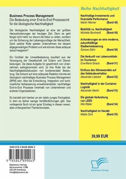 Ein Großteil der Umweltbelastung resultiert aus der Versorgung der Gesellschaft mit Gütern und Dienstleistungen. Und da diese Aufgabe für gewöhnlich von Unternehmen wahrgenommen wird, ist ihre Rolle bei der Nachhaltigkeitsdiskussion von größter Bedeutung. Die Antwort auf eine adäquate Reaktion könnte ein ökologisch nachhaltiges Business Process Management (BPM) sein. Also die Entwicklung, Integration und kontinuierliche Verbesserung umweltorientierter, nachhaltiger End-to-End Prozesse innerhalb von Unternehmen und anderen Organisationen. Es handelt sich hierbei um ein relativ junges Fachgebiet, in dem es bisher wenige Veröffentlichungen gibt und dieses Buch ist ein guter Einstieg in diesen neuen, aber umfangreichen Themenkomplex.