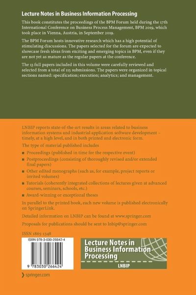 This book constitutes the proceedings of the BPM Forum held during the 17th International Conference on Business Process Management, BPM 2019, which took place in Vienna, Austria, in September 2019.