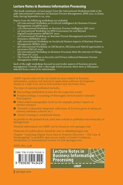 This book constitutes revised papers from the International Workshops held at the 19th International Conference on Business Process Management, BPM 2021, in Rome, Italy, during September 6-10, 2021.