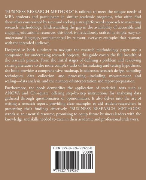 "BUSINESS RESEARCH METHODS" is tailored to meet the unique needs of MBA students and participants in similar academic programs, who often find themselves constrained by time and seeking a straightforward approach to mastering research methodology. Understanding the gap in the availability of accessible and engaging educational resources, this book is meticulously crafted in simple, easy-to-understand language, complemented by relevant, everyday examples that resonate with the intended audience. Designed as both a primer to navigate the research methodology paper and a companion for undertaking research projects, this guide covers the full breadth of the research process. From the initial stages of defining a problem and reviewing existing literature to the more complex tasks of formulating and testing hypotheses, the book provides a comprehensive roadmap. It addresses research design, sampling techniques, data collection and processing-including measurement and scaling-data analysis, and the nuances of interpretation and report preparation. Furthermore, the book demystifies the application of statistical tests such as ANOVA and Chi-square, offering step-by-step instructions for analyzing data gathered through questionnaires or opinionnaires. It also delves into the art of writing a research report, providing clear examples to aid student-researchers in presenting their findings effectively. "BUSINESS RESEARCH METHODS" stands as an essential resource, promising to equip future business leaders with the knowledge and skills needed to excel in their academic and professional endeavors.