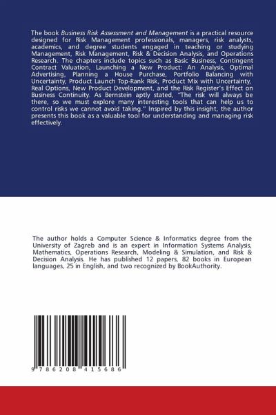 The book Business Risk Assessment and Management is a practical resource designed for Risk Management professionals, managers, risk analysts, academics, and degree students engaged in teaching or studying Management, Risk Management, Risk & Decision Analysis, and Operations Research. The chapters include topics such as Basic Business, Contingent Contract Valuation, Launching a New Product: An Analysis, Optimal Advertising, Planning a House Purchase, Portfolio Balancing with Uncertainty, Product Launch Top-Rank Risk, Product Mix with Uncertainty, Real Options, New Product Development, and the Risk Register's Effect on Business Continuity. As Bernstein aptly stated, "The risk will always be there, so we must explore many interesting tools that can help us to control risks we cannot avoid taking." Inspired by this insight, the author presents this book as a valuable tool for understanding and managing risk effectively.