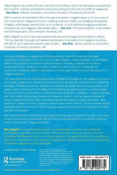 Business Strategies for Magazine Publishing explores tactics for creating financially sustainable publications in the 21st century. Mary Hogarth, media specialist, Senior Fellow (HEA) and lecturer in Journalism at Bournemouth University, analyses the historical development of the magazine industry, as well as current and future challenges for publishers, to illustrate different approaches to revenue generation and the maintenance of magazine brands. The book examines the wide-ranging impact of digital technology on how magazine content is consumed, revealing the dramatic consequences for advertising, distribution and marketing strategies. Traditional business models are evaluated alongside new online approaches, and readers will be introduced to the Magazine Publishing Strategic Quadrant, a model created by the author as an alternative to the Business Canvas Model. In addition, in-depth interviews with high-profile industry figureheads and magazine editors, such as Jessica Strawser of Writer's Digest and former Good Housekeeping Editorial Director Lindsay Nicholson, offer readers an insight into how to produce and monetise online content. These interviews appear alongside exercises and action plans that give readers the opportunity to put what they have learned into practice. With real-world advice and practical activities and resources throughout the book, journalism students and young professionals will find this an essential guide to successfully building a career in the modern magazine industry.