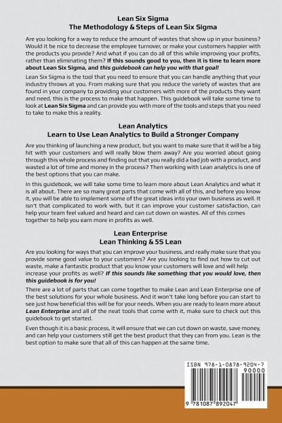 Lean Six SigmaThe Methodology & Steps of Lean Six SigmaAre you looking for a way to reduce the amount of wastes that show up in your business? Would it be nice to decrease the employee turnover, or make your customers happier with the products you provide? And what if you can do all of this while improving your profits, rather than eliminating them? If this sounds good to you, then it is time to learn more about Lean Six Sigma, and this guidebook can help you with that goal! Lean Six Sigma is the tool that you need to ensure that you can handle anything that your industry throws at you. From making sure that you reduce the variety of wastes that are found in your company to providing your customers with more of the products they want and need, this is the process to make that happen. This guidebook will take some time to look at Lean Six Sigma and can provide you with more of the tools and steps that you need to take to make this a reality. Lean AnalyticsLearn to Use Lean Analytics to Build a Stronger Company Are you thinking of launching a new product, but you want to make sure that it will be a big hit with your customers and will really blow them away? Are you worried about going through this whole process and finding out that you really did a bad job with a product, and wasted a lot of time and money in the process? Then working with Lean analytics is one of the best options that you can make. In this guidebook, we will take some time to learn more about Lean Analytics and what it is all about. There are so many great parts that come with all of this, and before you know it, you will be able to implement some of the great ideas into your own business as well. It isn't that complicated to work with, but it can improve your customer satisfaction, can help your team feel valued and heard and can cut down on wastes. All of this comes together to help you earn more in profits as well. Lean Enterprise Lean Thinking & 5S LeanAre you looking for ways that you can improve your business, and really make sure that you provide some good value to your customers? Are you looking to find out how to cut out waste, make a fantastic product that you know your customers will love and will help increase your profits as well? If this sounds like something that you would love, then this guidebook is for you!There are a lot of parts that can come together to make Lean and Lean Enterprise one of the best solutions for your whole business. And it won't take long before you can start to see just how beneficial this will be for your needs. When you are ready to learn more about Lean Enterprise and all of the neat tools that come with it, make sure to check out this guidebook to get started.