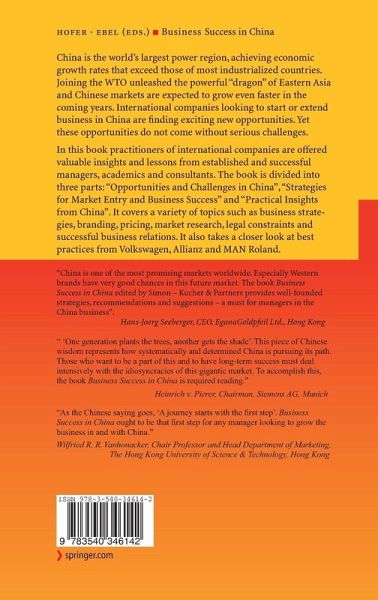In this book practitioners of international companies are offered valuable insights and lessons from established and successful managers, academics and consultants. The book is divided into three parts: "Opportunities and Challenges in China", "Strategies for Market Entry and Business Success" and "Practical Insights from China". It covers a variety of topics such as business strategies, branding, pricing, market research, legal constraints and successful business relations. It also takes a closer look at best practices from Volkswagen, Allianz and MAN Roland.