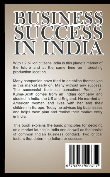 With 1.2 billion citizens India is this planets market of the future and at the same time an interesting production location.Many companies have tried to establish themselves in this market early on. Many without any success.The successful business consultant Pandit. A. Kuma-Scott comes from an Indian company and studied in India, the US and England. He married an American woman and lives with her and their children in Europe. Today he advises big businesses and helps them plan and realise their market entry in India.This book explains the basic principles for deciding on a market launch in India and as well as the basics of common Indian business conduct. Two critical factors that determine failure or success.