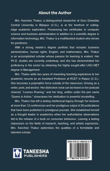 Mrs. Kanchan Thakur, a distinguished researcher at Guru Ghasidas Central University in Bilaspur (C.G.), is at the forefront of cutting-edge academic exploration. Possessing two certificates in computer science and business administration in addition to a scientific degree in information technology, Mrs. Thakur is a multifaceted student who strives for greatness.With a strong master's degree portfolio that includes business administration, human rights, English, and mathematics, Mrs. Thakur is an accomplished scholar whose passion for learning is evident. Her Ph.D. studies are currently undertway, and she has demonstrated her proficiency in the sector by obtaining the highly sought-after UGC-NET degree in Management.Mrs. Thakur adds two years of rewarding teaching experience to her academic resume as an Assistant Professor at RCET in Raipur (C.G.). She becomes a polymathic force outside of the classroom, thriving as a writer, poet, and anchor. Her distinctive voice can be heard on her podcast channel, "Lioness Roaring," and her blog, written under the pen name "Queen in Action," showcases her dedication to powerful storytelling.Mrs. Thakur has left a lasting intellectual legacy through her lectures at more than 12 conferences and her prodigious output of 26 publications that have been published in prestigious journals. She established herself as a thought leader in academics when her authoritative observations led to the release of a book on consumer behaviour. Leaving a lasting impression on the fields of research, teaching, and artistic expression, Mrs. Kanchan Thakur epitomises the qualities of a formidable and talented scholar.