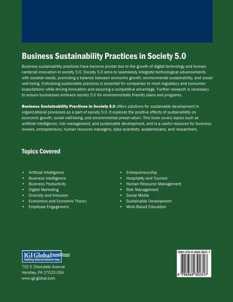 Business sustainability practices have become pivotal due to the growth of digital technology and human-centered innovation in society 5.0. Society 5.0 aims to seamlessly integrate technological advancements with societal needs, promoting a balance between economic growth, environmental sustainability, and social well-being. Embracing sustainable practices is essential for companies to meet regulatory and consumer expectations while driving innovation and securing a competitive advantage. Further research is necessary to ensure businesses embrace society 5.0 for environmentally friendly plans and programs. Business Sustainability Practices in Society 5.0 offers solutions for sustainable development in organizational processes as a part of society 5.0. It explores the positive effects of sustainability on economic growth, social well-being, and environmental preservation. This book covers topics such as artificial intelligence, risk management, and sustainable development, and is a useful resource for business owners, entrepreneurs, human resource managers, data scientists, academicians, and researchers.