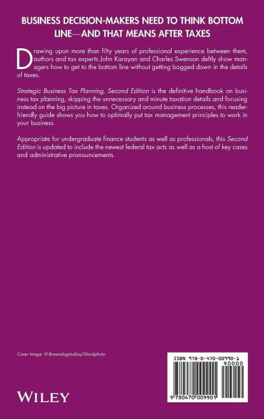 Strategic Business Tax Planning, Second Edition is the definitive handbook on business tax planning, skipping the unnecessary and minute taxation details and focusing instead on the big picture in taxes. Organized around business processes, this reader friendly guide shows you how to optimally put tax management principles to work in your business.