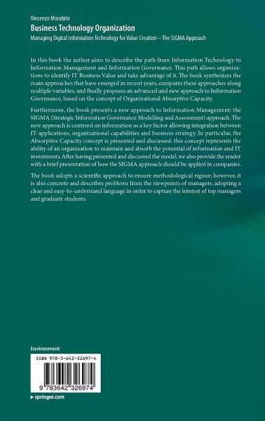 In this book the author aims to describe the path from Information Technology to Information Management and Information Governance. This path allows organizations to identify IT Business Value and take advantage of it. The book synthesizes the main approaches that have emerged in recent years, compares these approaches along multiple variables, and finally proposes an advanced and new approach to Information Governance, based on the concept of Organizational Absorptive Capacity.